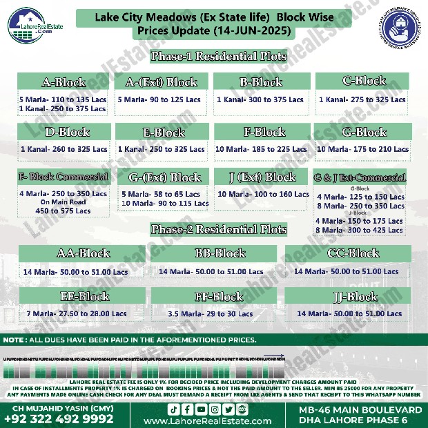 Lake City Meadows Ex State Life Housing Scheme Lahore Plot Prices Blockwise Rates June 16, 2025