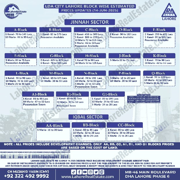 LDA City Lahore Plot Prices Blockwise Rates June 16, 2025