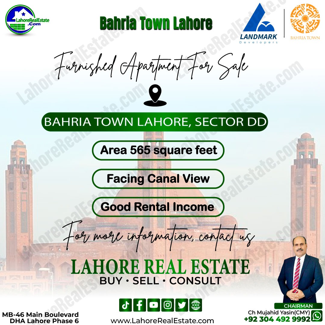Looking for a prime investment opportunity? Lahore Real Estate is offering a fully furnished 565 sq. ft. apartment in Bahria Town Lahore, Sector DD with a canal-facing view and great rental income potential!