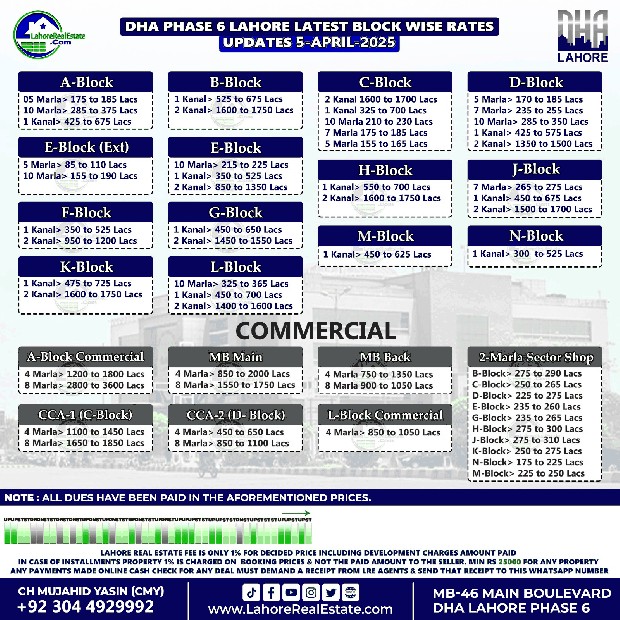 DHA Lahore Phase 6 Plot Prices Blockwise Rates April 08, 2025,