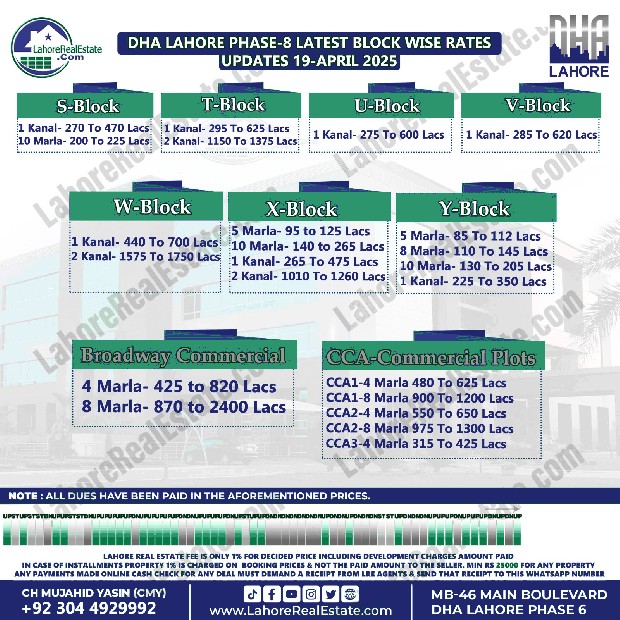 DHA Lahore Phase 8 Plot Prices Blockwise Rates April 21, 2025,