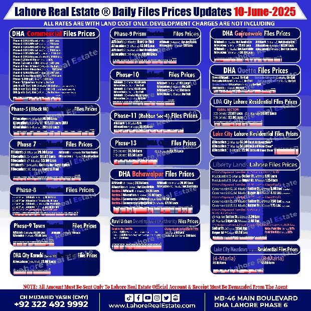 Disclaimer: This update reflects the current market status as of June 10, 2025. File rates can fluctuate. We recommend consulting with Lahore Real Estate ® for the most recent information and expert guidance tailored to your specific investment goals.