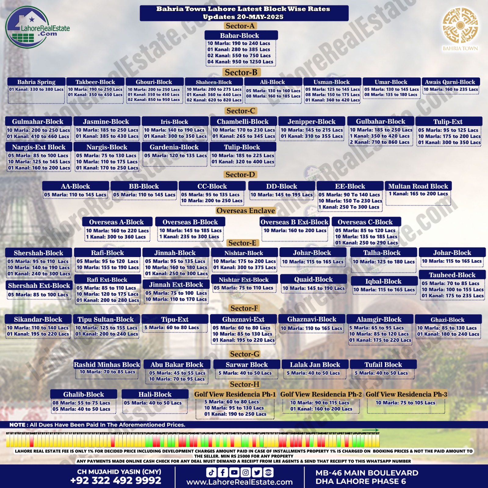 Bahria Town Lahore consists of six main sectors: A, B, C, D, E, and F. Each sector includes several blocks with properties designed to meet the diverse needs of its residents.