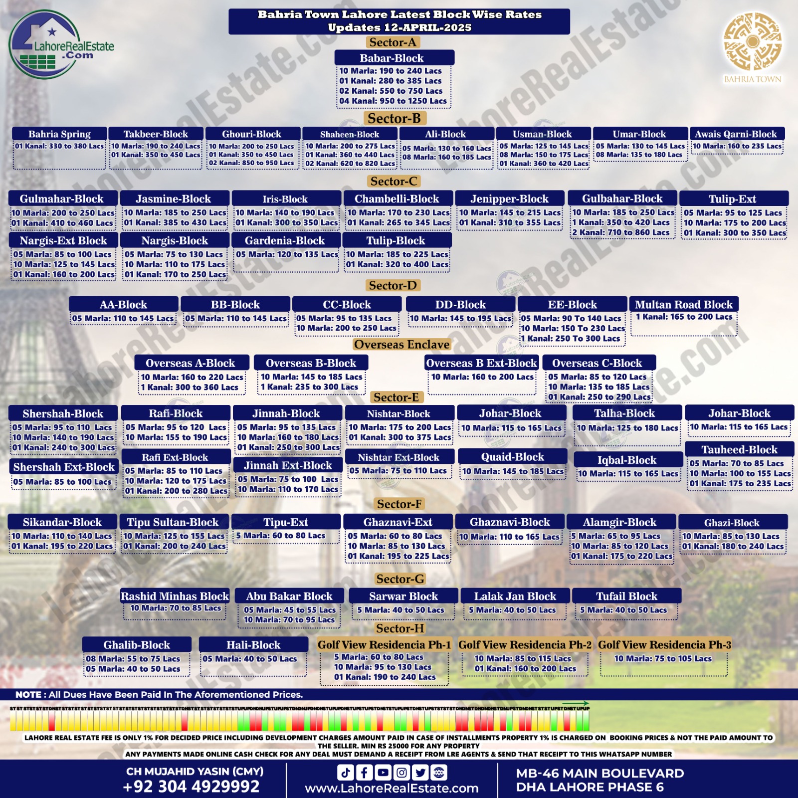 Bahria Town Lahore Plot Prices Blockwise Rates November 05, 2025