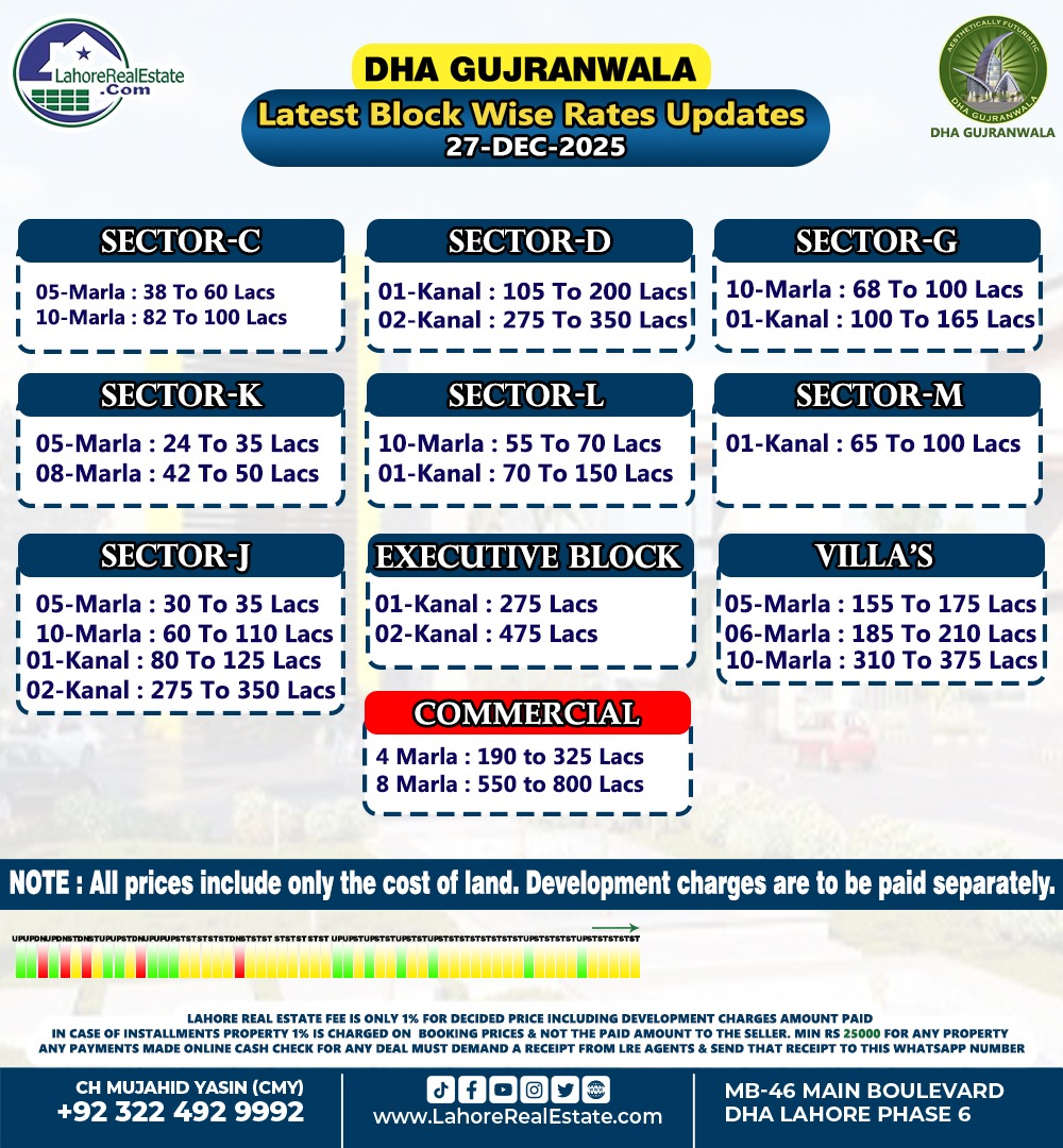 If you’re planning to invest in Lahore’s real estate market, this comprehensive update on blockwise rates or plot prices will help you make informed decisions. These are the latest 14th January, 2026 rates for DHA Lahore and other prominent housing societies, including development status and price trends.