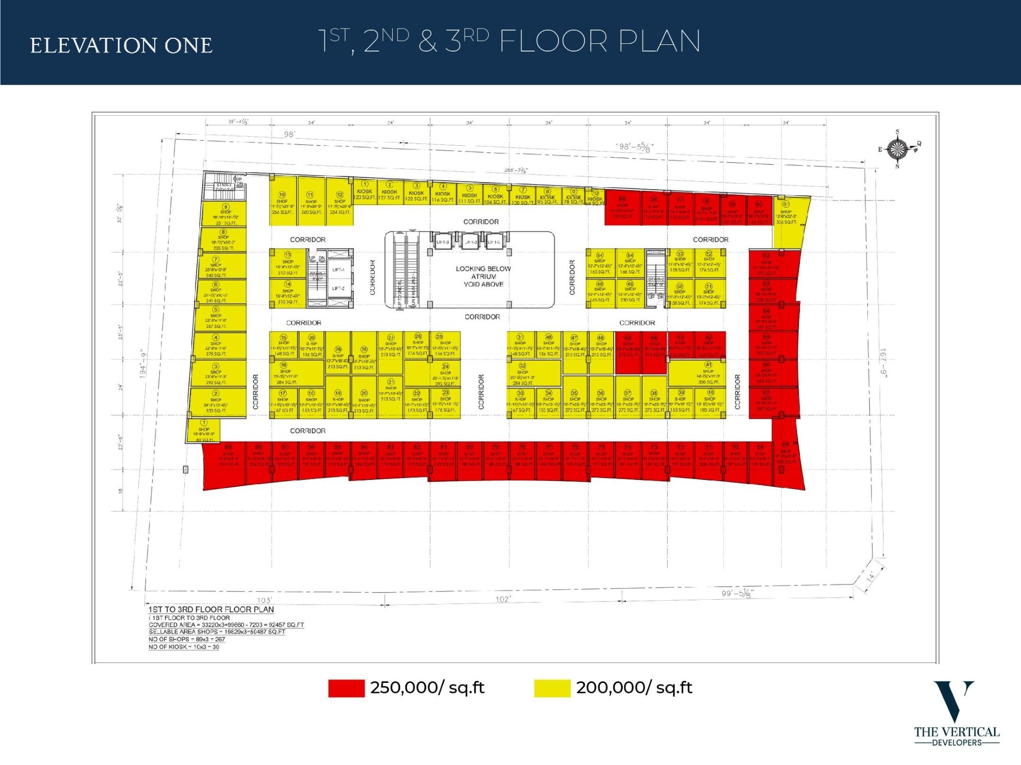The commercial success of a high-rise retail project is predicated on the optimization of every square foot. Elevation One employs a color-coded zoning strategy to differentiate shop values based on visibility, accessibility, and proximity to main entrances and escalators [Image 1, Image 2].