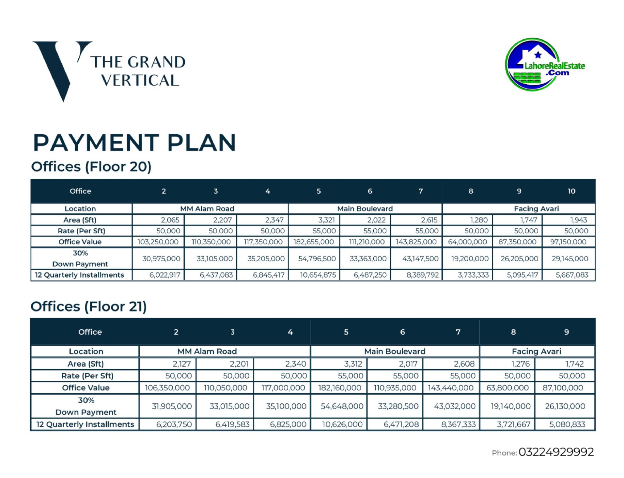 The developers of The Grand Vertical have structured a flexible 3-year payment plan designed to facilitate affordable entry into one of Gulberg’s most prime developments. The schedule is purposefully investor-friendly, allowing buyers to secure early ownership during the peak appreciation phase.