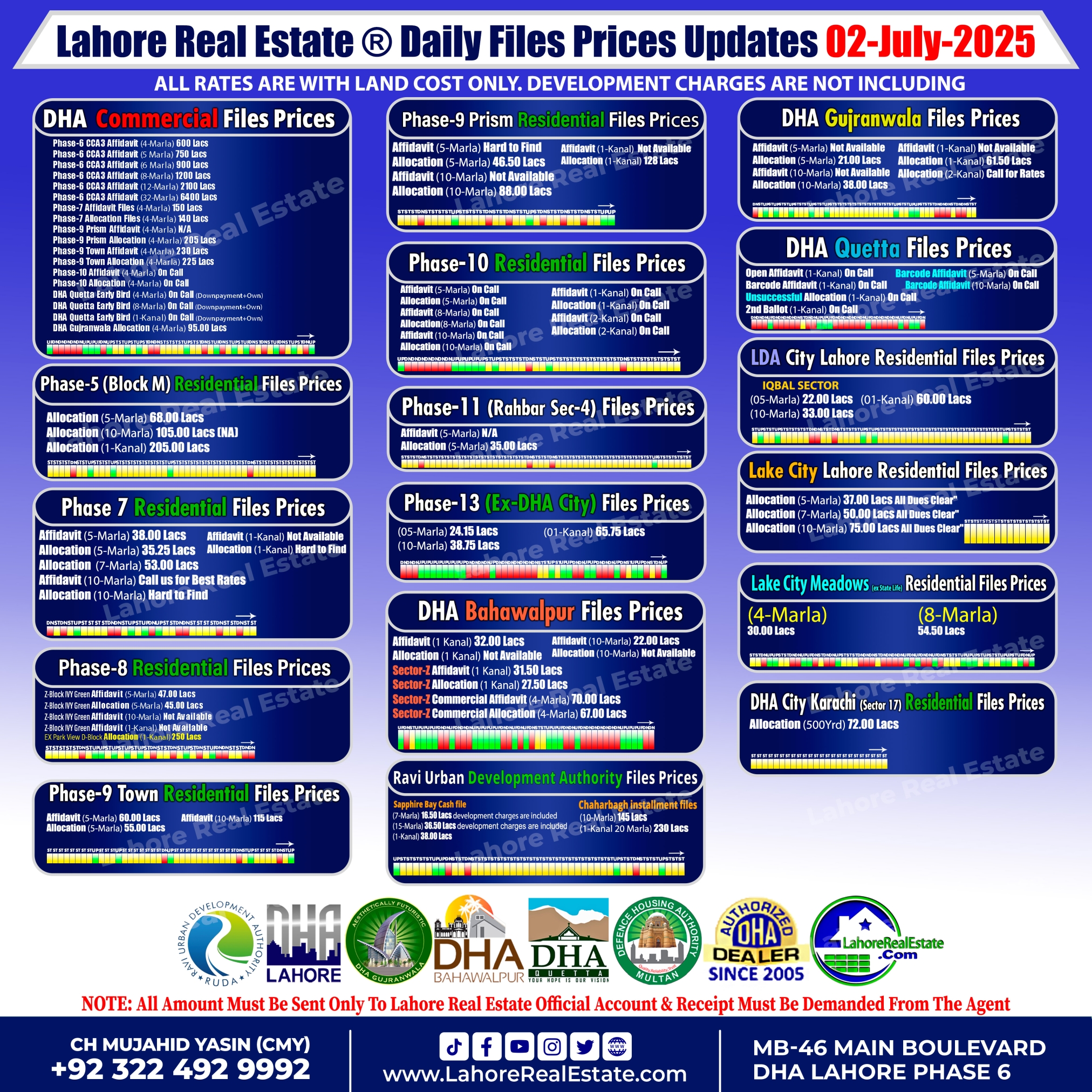 Stay informed with the most up-to-date real estate file rates and a comprehensive market overview for July 02, 2025 in Pakistan. Get expert insights on residential and commercial plots across DHA Lahore, DHA Quetta, DHA Bahawalpur, DHA Gujranwala, and more, including allocation vs. affidavit file prices. Understand key trends, investment opportunities, and challenges shaping Pakistan’s dynamic property sector.