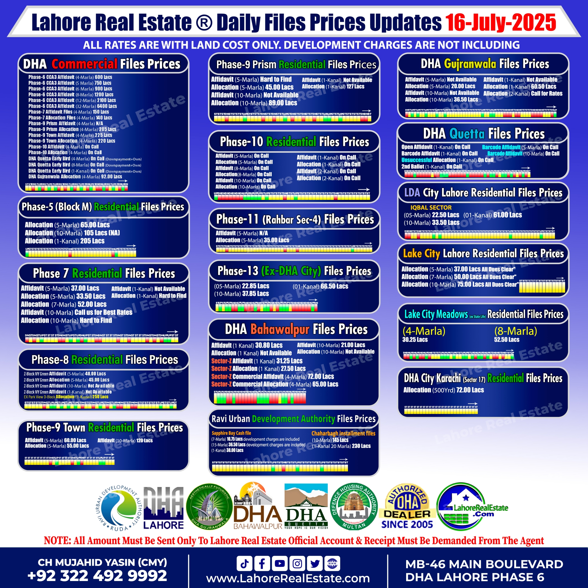 Get the most current property file rates for DHA (Lahore, Gujranwala, Quetta, Bahawalpur, Multan), LDA City, and RUDA as of July 16, 2025. This in-depth report offers a comprehensive analysis of Pakistan’s real estate market trends and emerging investment hotspots nationwide. Essential insights for local and overseas buyers, sellers, and investors.