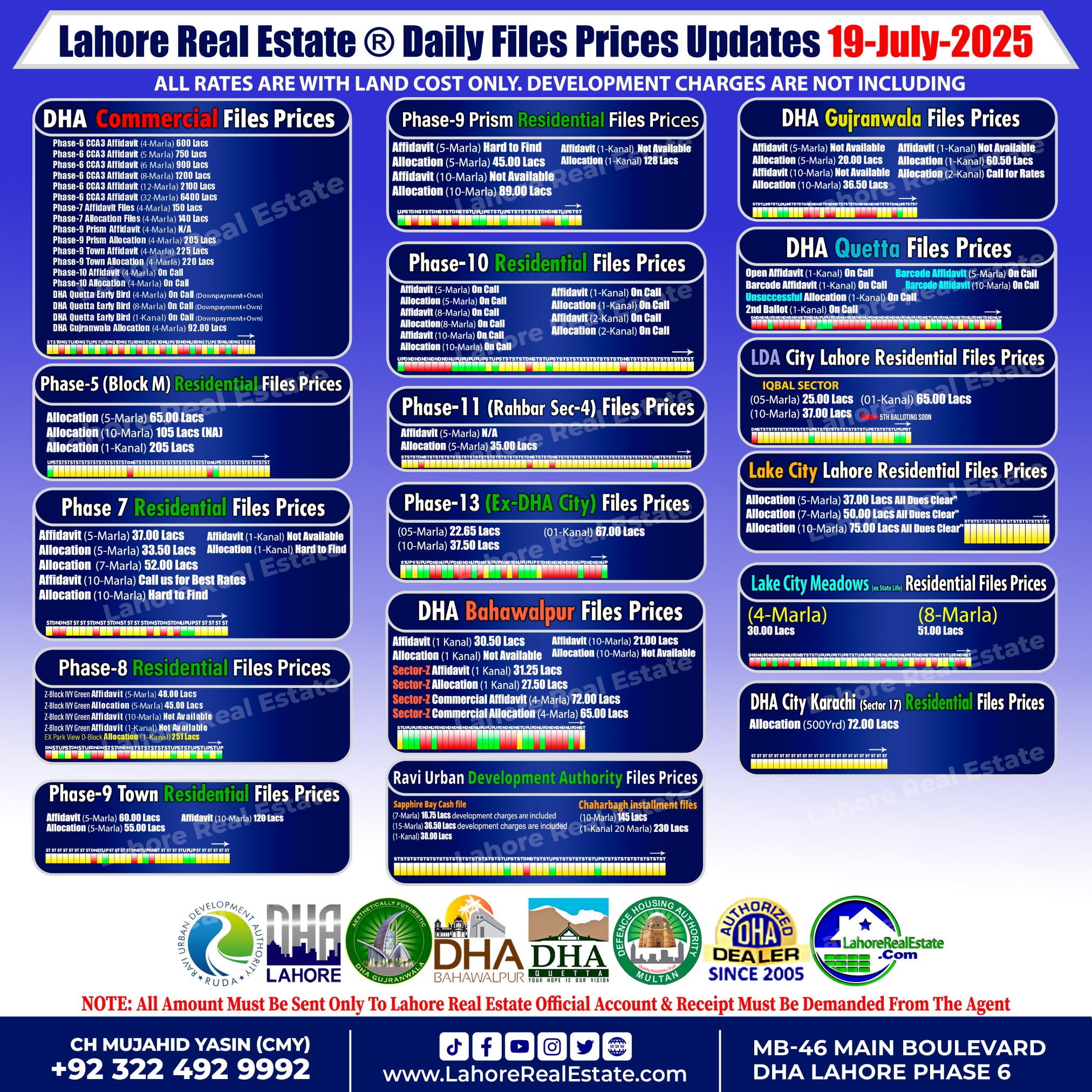 Discover the most current file rates for major real estate projects across Pakistan, including DHA phases in Lahore, Karachi Bahawalpur, Gujranwala, and Quetta, as well as Lake City, LDA City & RUDA as of July 19, 2025. This in-depth report provides critical insights into residential and commercial plot prices, prevailing market trends, and lucrative investment opportunities in Pakistan’s evolving property sector.
