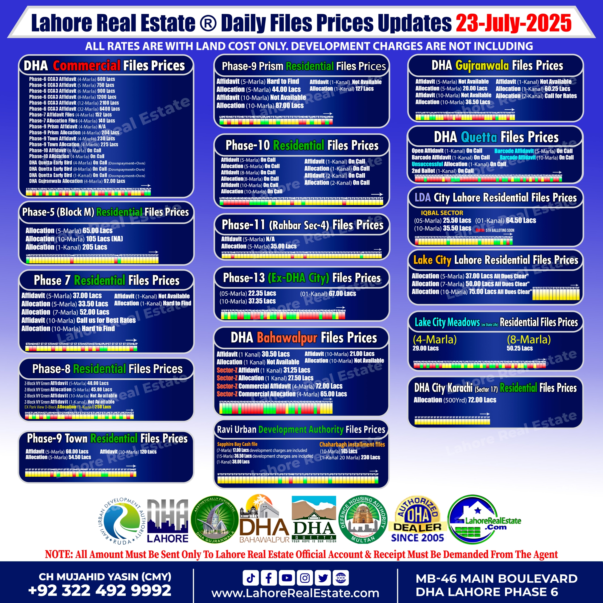 Get the most up-to-date real estate file rates for DHA Lahore (Phases 7, 9, 10, Prism, Town, 13), DHA Quetta, DHA Gujranwala, LDA City, Lake City, and RUDA in Pakistan for July 23, 2025. Explore current market trends, property investment opportunities, and expert insights for buyers and sellers in Lahore, Karachi, and Quetta. Stay ahead with our comprehensive real estate overview.