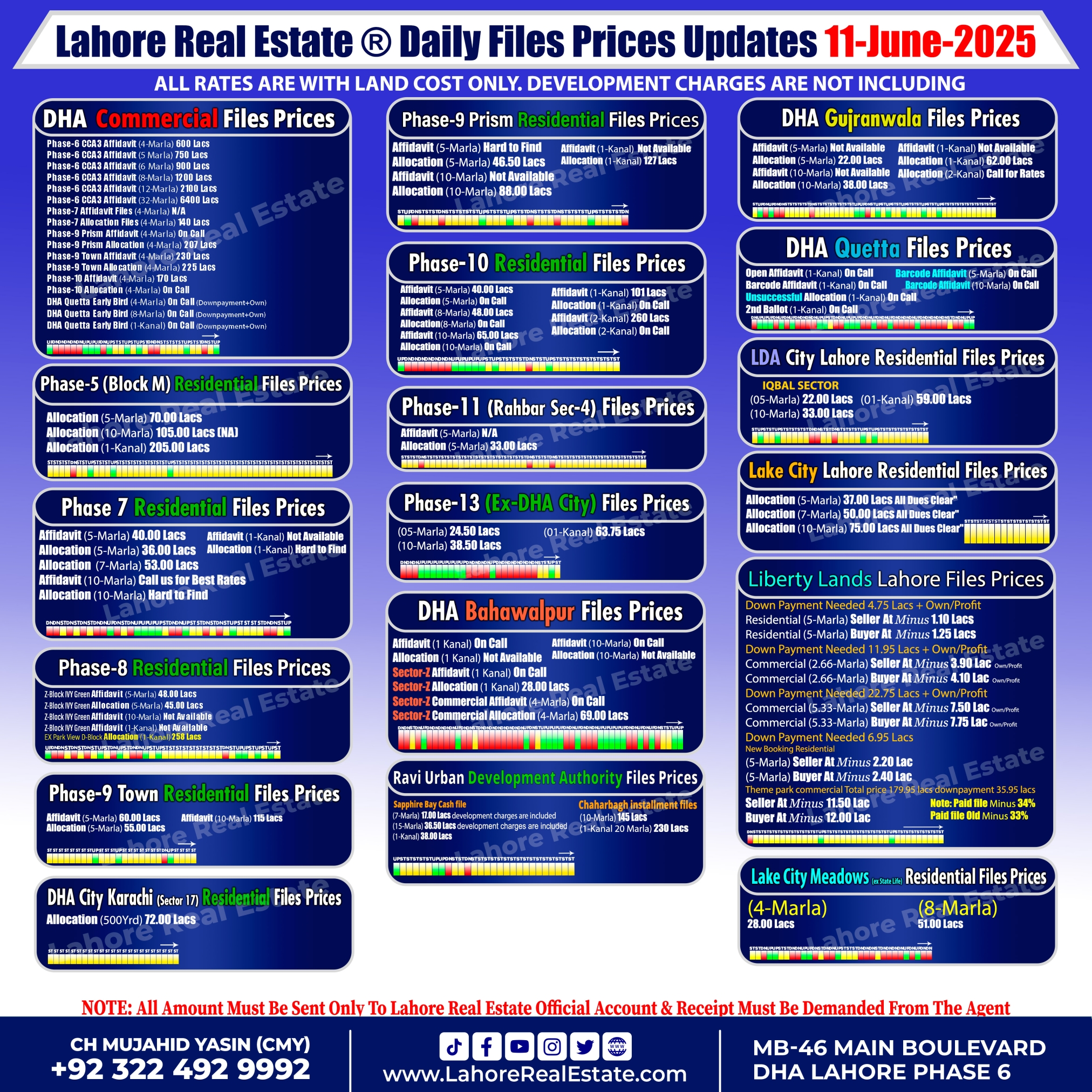 Get the most up-to-date analysis of the dynamic real estate market for June 2025. Discover the latest file rates across DHA Lahore (Phases 5, 7, 8, 9 Prism, 9 Town, 10, 11, 13), LDA City, Lake City, Liberty Lands, and RUDA projects like Chahar Bagh and Sapphire Bay. Explore key investment opportunities, current market trends, and expert insights to make informed property decisions in Pakistan’s thriving real estate sector. Stay ahead with comprehensive data on residential and commercial plot files, including affidavit and allocation rates.