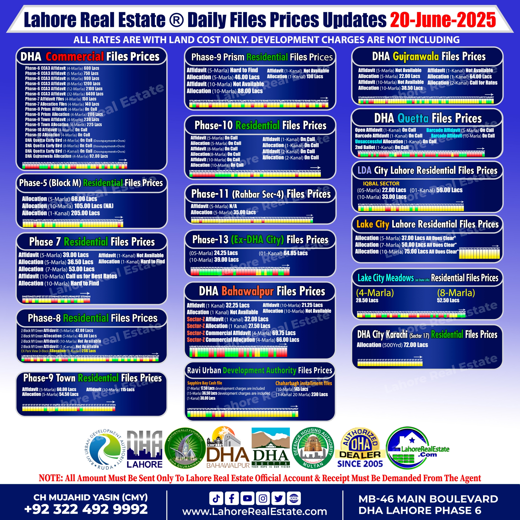 Get the most up-to-date file rates and a comprehensive market overview for Pakistan real estate sector as of June 20, 2025. This in-depth analysis covers pricing trends across prominent societies like DHA Lahore (all phases including Phase 5, 7, 9 Prism, 9 Town, 10, 13), DHA Bahawalpur, DHA Gujranwala, Lake City Meadows, LDA City, and RUDA projects.