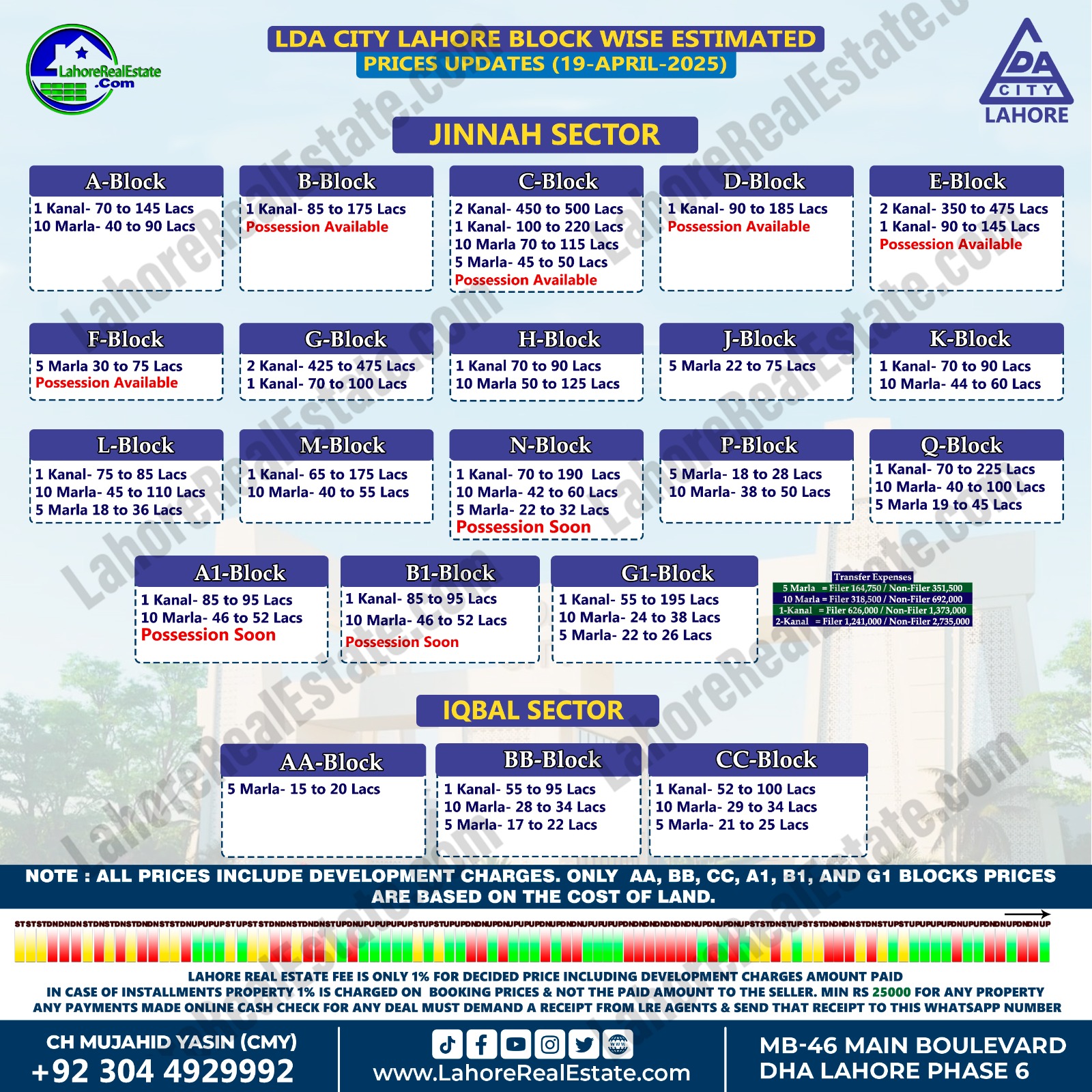 | LDA City Jinnah | 1 Kanal Blockwise Price | A - 1K@82-150 | Ch Mujahid Yasin +923224929992 Updated: 13-12-2025 |