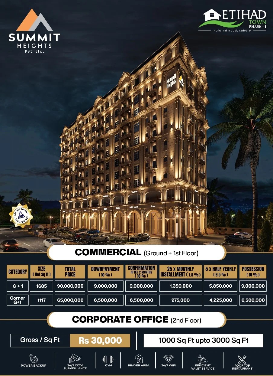 Summit Heights is a landmark mixed-use real estate project located in the prime commercial district of Etihad Town Phase 1, just off Main Raiwind Road, Lahore. The project offers an exclusive combination of luxury apartments, commercial shops, and corporate offices on a flexible 2.5-year installment plan.
